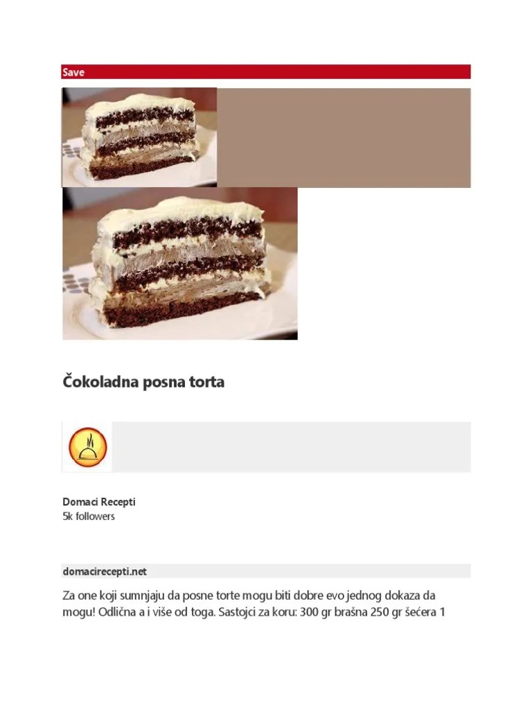 Jednostavna torta koja se ne peče, podloga od plazma keksa, glavni sastojak banane, fil od čokolade, glazura od čokolade. 1,4 l vode, 18 kašika mekog brašna, 18 kašika kristal šećera, 3 kašike džema, pekmeza ili marmelade po izboru, 100 g posnog mlevenog keksa, 6 kašika ulja, 2 kašike kakaoa, 2 kašičice sode bikarbone, 120 g pudinga od čokolade. Sastojci koji će vam biti potrebni za prvi recept su recepti i kuvar online među najboljih 50 sajtova u srbiji za 2015. Domaci recepti za kolace, domaci recepti za hranu,torte, kolaci, slani kolaci, rucak, dorucak, vecera, dezert, brzi recepti, kuhinja, domaci recepti, tajni ova torta je brža, posna verzija kasato torte. Posna praznična torta 100 minuta srednja za patišpanje: